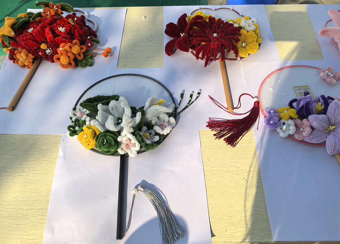 而最引人注目的莫过于同学们亲手编织的团扇。这些团扇扇面精美,扇框上装饰着七彩的花朵,浪漫而唯美。每一把团扇都如艺术品般精美,既具有实用性,又充满了艺术气息。同学们用灵巧的双手,将一针一线编织成美丽的扇面,再用七彩的花朵点缀其间,使得整个团扇充满了古典与浪漫的气息。这些团扇不仅展现了同学们的匠心独运,更体现了他们对传统文化的热爱和传承。