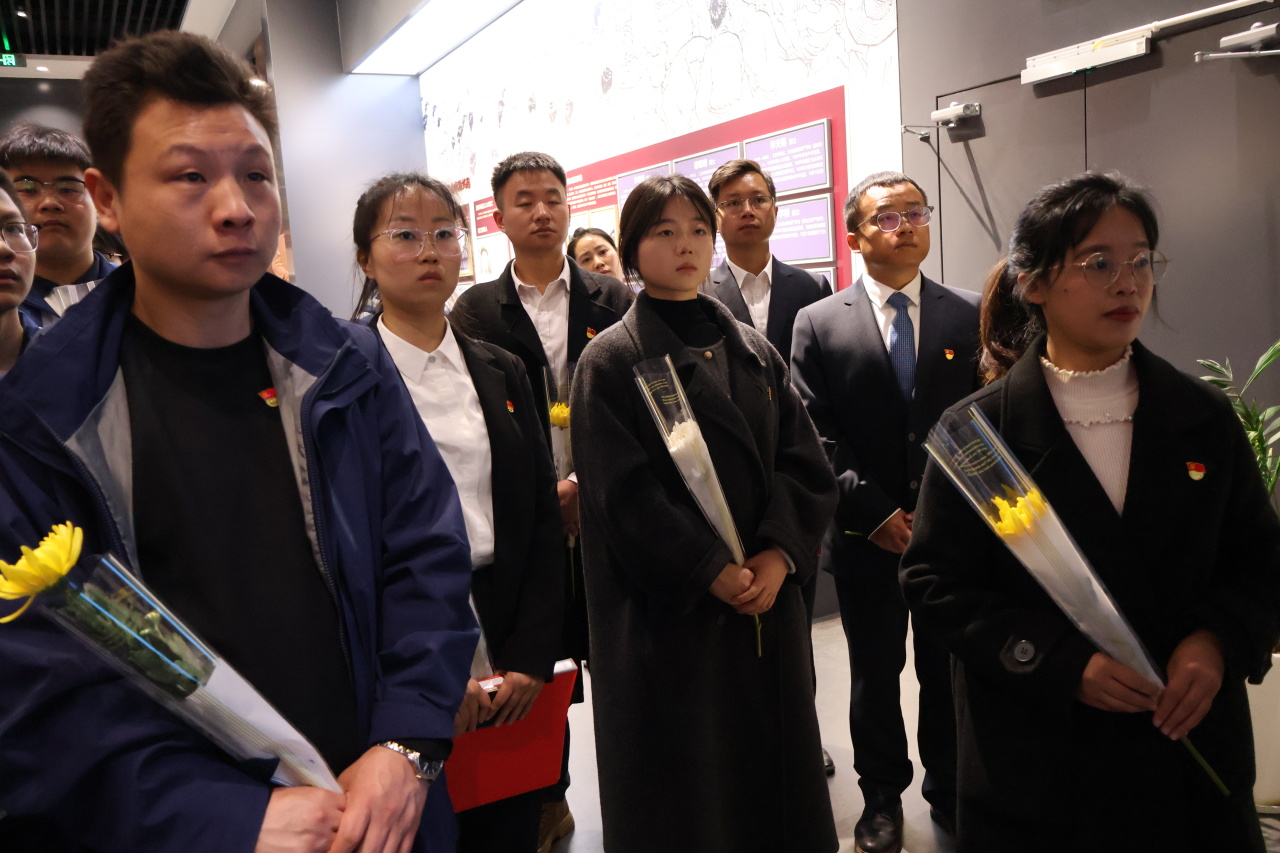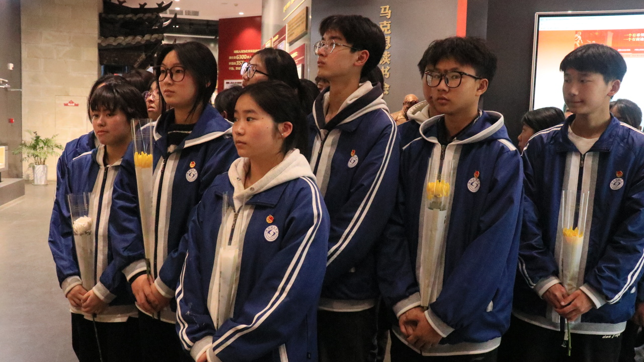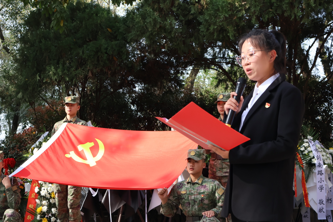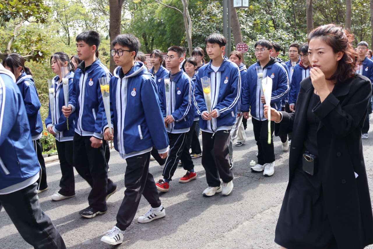 奏唱国歌,党员代表与团员代表分别发言并宣誓;校领导整理花篮缎带,号召师生继承先烈遗志;全体三鞠躬,有序离场,将敬意化作前进的动力。