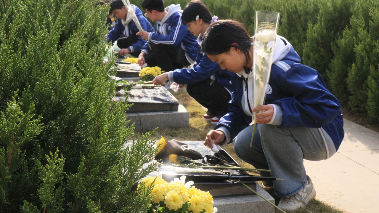 下午3:20,师生们整齐列队于烈士陵园,举行庄重的扫墓仪式: